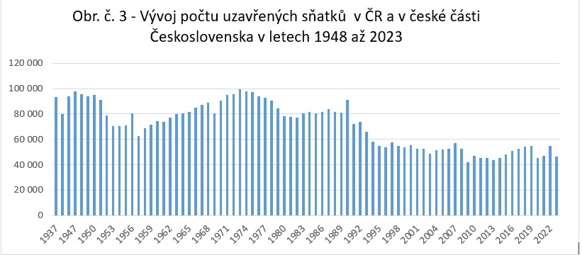 Pro doplnění uvádím ještě vývoj počtu uzavřených sňatků v českých a moravských krajích.