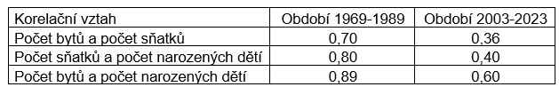 Korelace mezi výstavbou bytů a počtem narozených dětí v letech 1949 až 2025 činí 0,55. Pro období let 1970 až 1989 je korelace 0,89 a pro roky 1990 až 2025 hodnota 0,60. Korelace v rozmezí 0,8 až 0,99 se považuje za velmi silnou, zatímco korelace mezi 0,4 a 0,8 za střední. Korelace mezi počtem bytů a počtem sňatků v letech 1949 až 2023 činí 0,67. Korelace mezi počtem sňatků a počtem narozených dětí je 0,83. Z uvedených korelací je patrné, že souvislost mezi byty, sňatky a počtem narozených dětí je velmi silná.