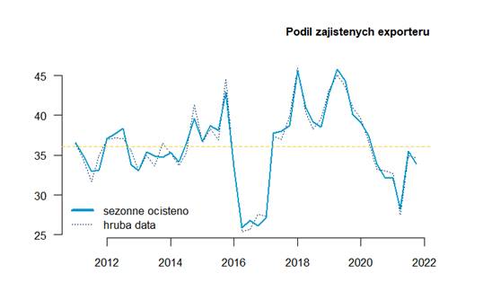 Do budoucna je na druhou stranu bezesporu pozitivní zprávou, že úroveň zajištění exportérů na konci roku poměrně překvapivě poklesla (i když jen mírně …viz graf). To může koruně vzhledem k rozšiřujícímu se úrokovému diferenciálu (atraktivity zajištění) časem hrát do karet - zvlášť ve chvíli, kdy v českém průmyslu výrazněji poleví napětí v subdodavatelských řetězcích a exportéři dostanou chuť na “agresivnější” zajištění.