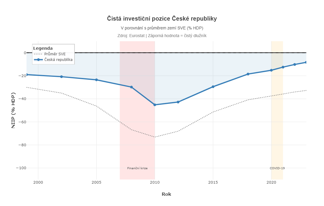 Střední a východní Evropa je touto optikou někde uprostřed pelotonu. Navíc uvnitř ní přetrvávají velké rozdíly, a slabý dolar v ní proto může působit značně nerovnoměrně. Nejzápornější čistou investiční pozici v regionu má Rumunsko (-44% HDP) a současně se mu také za poslední dvě dekády jako jediné větší ekonomice v regionu investiční pozice viditelně zhoršila. Rumunsko tedy může ze slabého dolaru teoreticky v rámci regionu profitovat nejvíce. Polsku a Maďarsku se sice za poslední dvě dekády investiční pozice vylepšila, stále zůstává ale viditelně záporná (přes -30% HDP). Polsko a Maďarsko, stejně tak jako zlotý a forint, tedy mohou ze slabého dolaru také těžit, což už jsme ostatně viděli v posledních měsících na trzích. Nejmenší potenciál těžit ze slabého dolaru má touto optikou Česko. Zahraniční investiční pozice (vývoj viz graf) je jen v lehkém záporu (-10% HDP) a to navíc převážně kvůli přímým zahraničním investicím. Navíc efekt slabého dolaru bude v celém regionu zeslabovat skutečnost, že značná část zahraničního dluhu je na rozdíl od jiných rozvíjejících se trhů (například Latinské Ameriky) denominována v eurech.