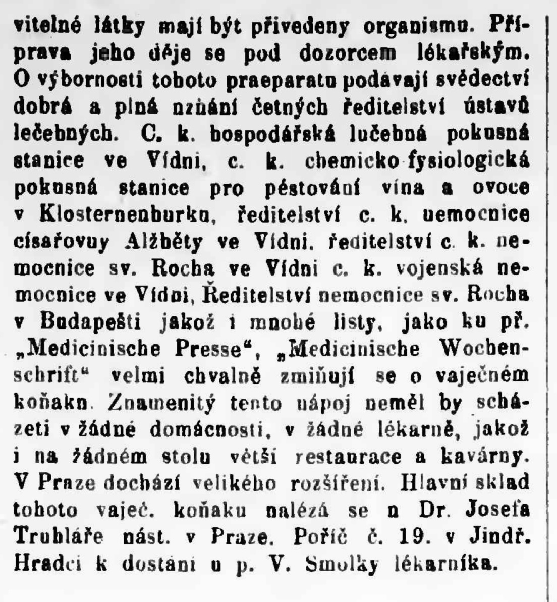 Dobová zpráva rovněž zmiňuje, že vaječný koňak měl značný úspěch v Praze, kde docházelo k jeho rozšíření. Hlavní sklad tohoto posilujícího nápoje se nacházel u Dr. Josefa Truhláře v Praze na adrese Poříčí č. 19, a také v Jindřichově Hradci u lékárníka V. Smoljky.